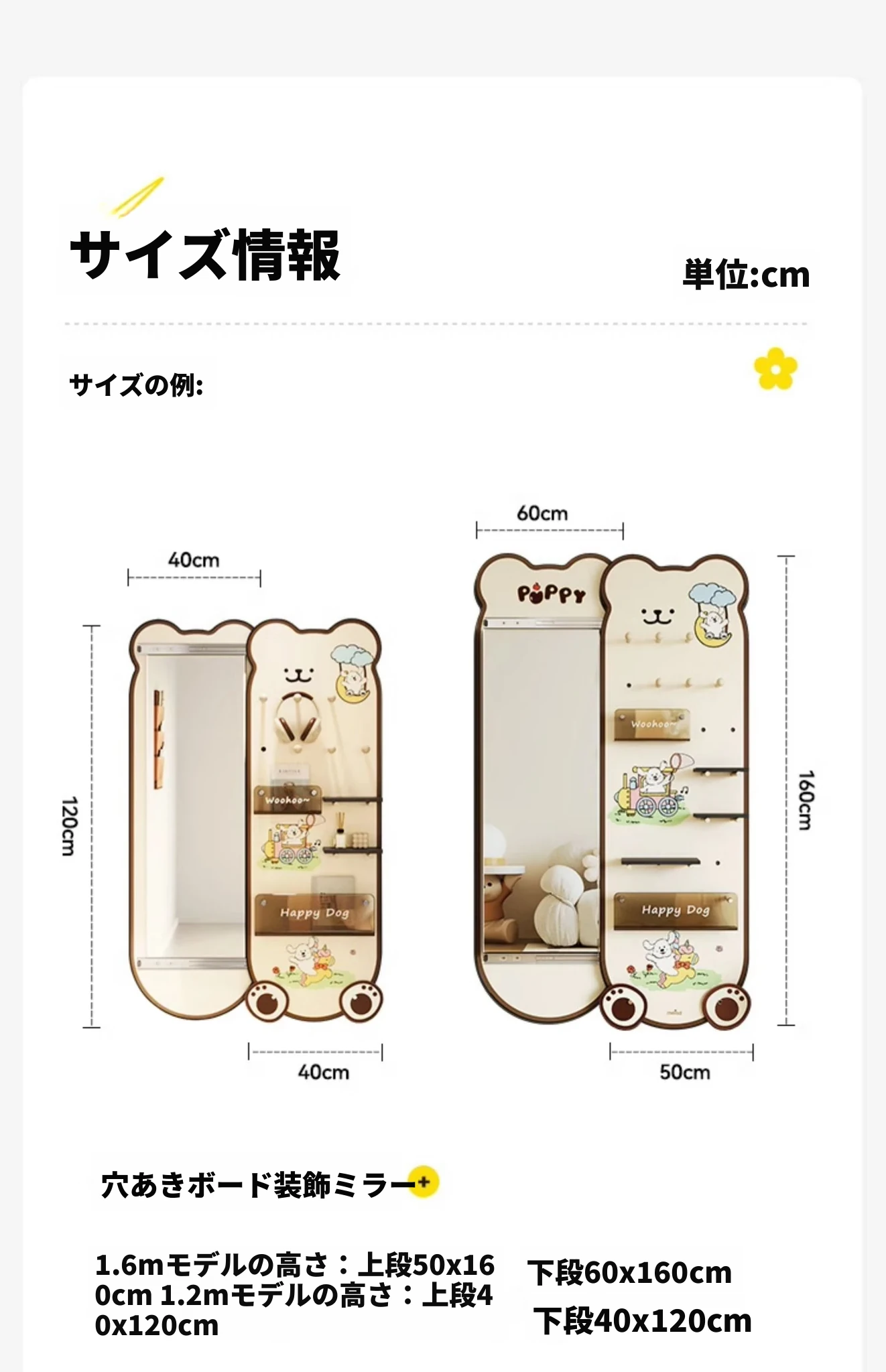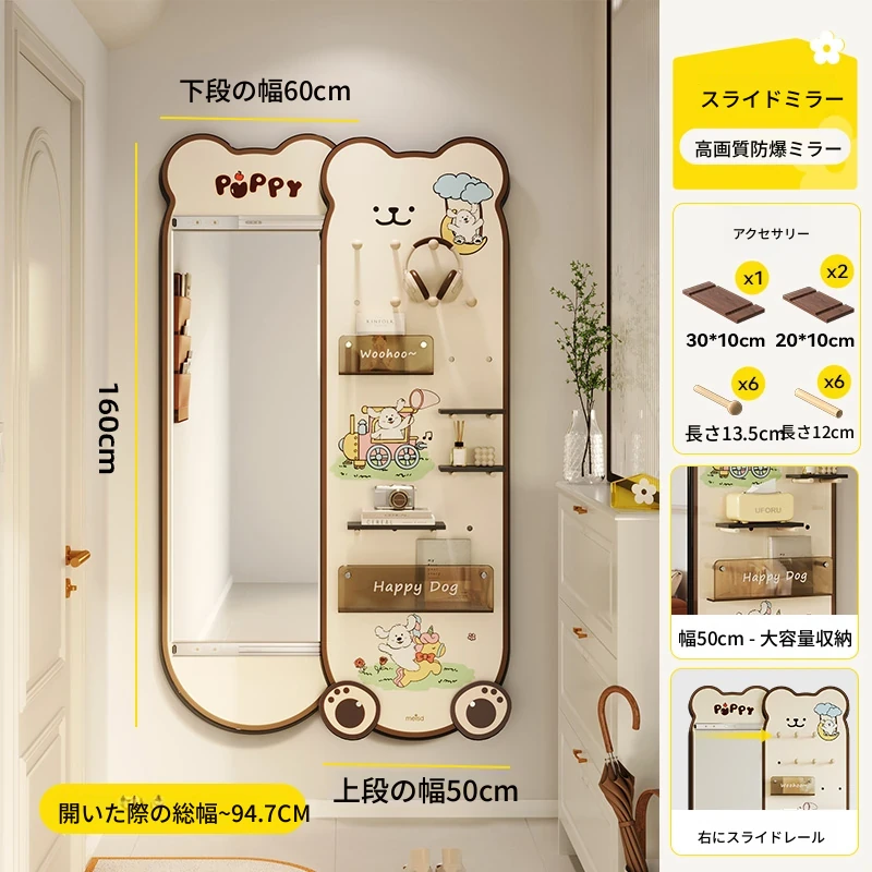 ●右スライド●ライン小犬●160×60cm●開いた時の幅約94.7cm●厚鏡面 下段60X上段50CM
